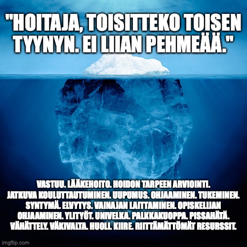 Olen ollut viime aikoina enimmäkseen kyllästynyt. Keskustelu hoitotyöstä kulkee samaa kehää, jossa rankkaa on ja nuoria pitäisi saada sitoutumaan alalle ja palkkataso vakavasti otettavaksi. Totta kumpikin. Välillä pilkahtelee kivoja some-päivityksiä siitä, miten työkaverit auttavat jaksamaan. Niitä minäkin voisin kirjoittaa kyllästymiseen asti. Suurimpana osana päivistä olen nimittäin vilpittömästi sitä mieltä.